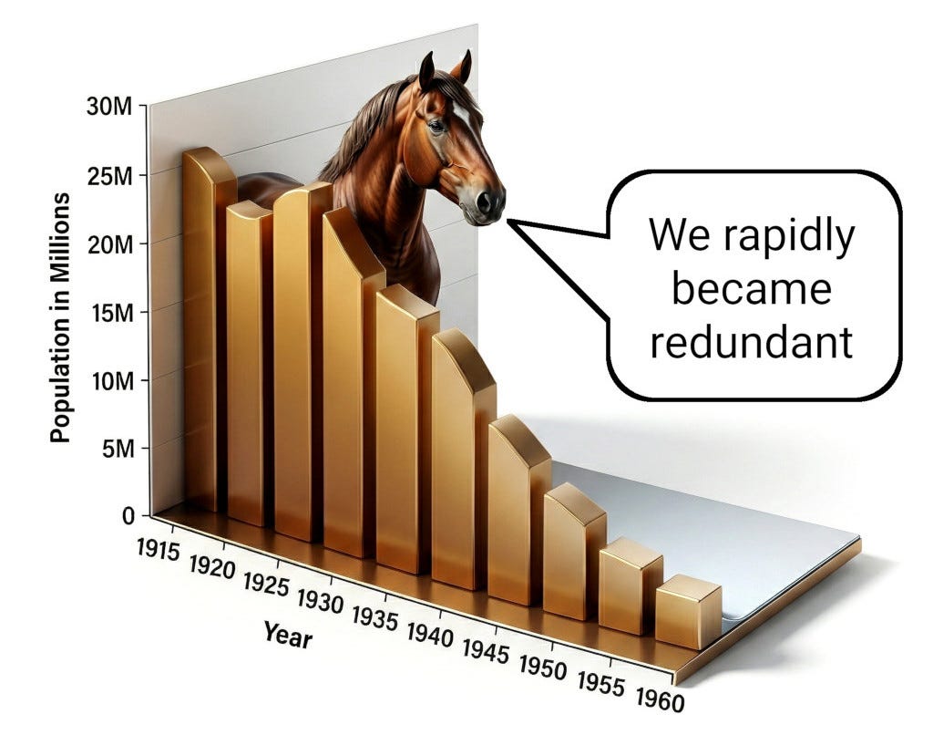 When the internal combustion engine showed up, it was simply a better engine for the same job. It was cheaper per unit of work, it was more scalable, it didn’t get tired and it kept getting better every year. And this led to the horse population of the United States plummeting from 26 million in 1915 to 3 million by 1960. It wasn’t because horses got worse - their capability didn’t change at all. It was because a better engine had arrived. Some niches did survive - recreation, ceremony, companionship, search and rescue. The kinds of things where horses still made sense, for reasons that weren’t really about economics. But the rest of the horse population did not move into new horse jobs. Because there weren’t any.