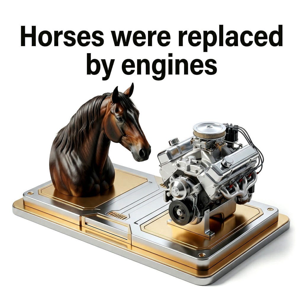 What I want to add to this conversation now is quite specific. All of these versions used horses as a comparison - an effective way to make their argument feel real. But I think this comparison should go further than any of them take it. It works as a real structural claim about how economies work, and how value is created. But first, I want to paint a more up-to-date picture using a new perspective.